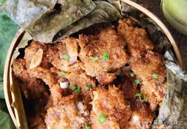 8、中火蒸1小時至排骨酥軟,揭去荷葉,撒上蔥花即可享用。