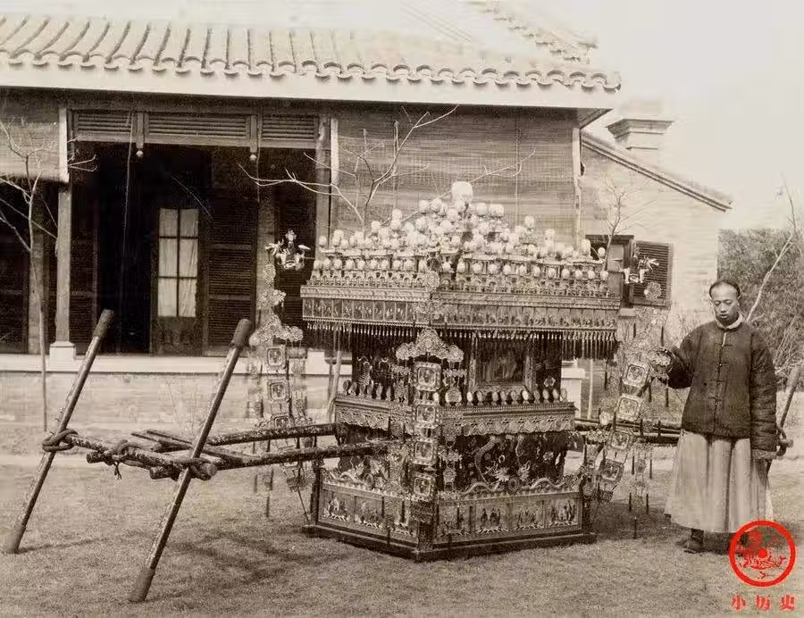 這種迎接新娘的轎子是清朝晚期產生的「千工轎」 或「萬工轎」,因製作要耗費數千上萬工時而得名。它採用榫卯結構聯結,沒有一枚釘子,由幾百片可拆卸的花板組成,沒有轎門,迎親時拆轎師傅跟隨在迎親隊伍里負責拆卸,使新娘方便出入。遠遠望去金碧輝煌,猶如一座微型的宮殿,可惜黑白照片無法還原它的閃耀色彩。