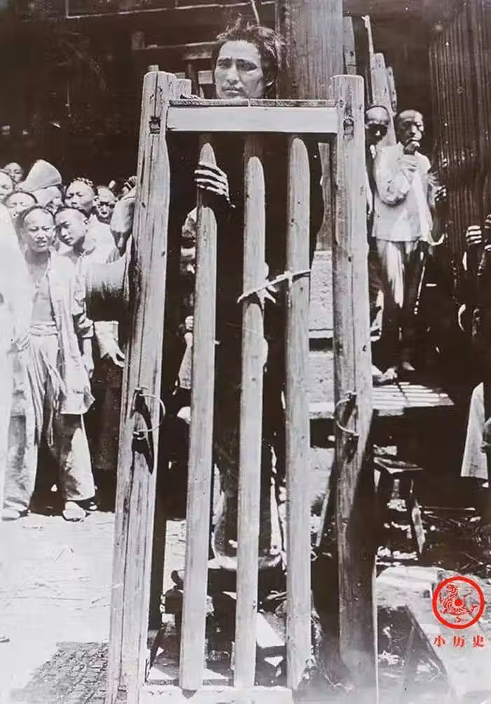 這名囚徒站在一種名為「立枷」(又稱為「站籠」)的刑具里,晝夜站立,站多久要看官府判處的天數。籠口卡住脖子,他在裡面無法吃喝拉撒,痛苦不堪。如果是重刑犯,他腳下的磚頭將被逐漸撤出,讓他懸空窒息而死。