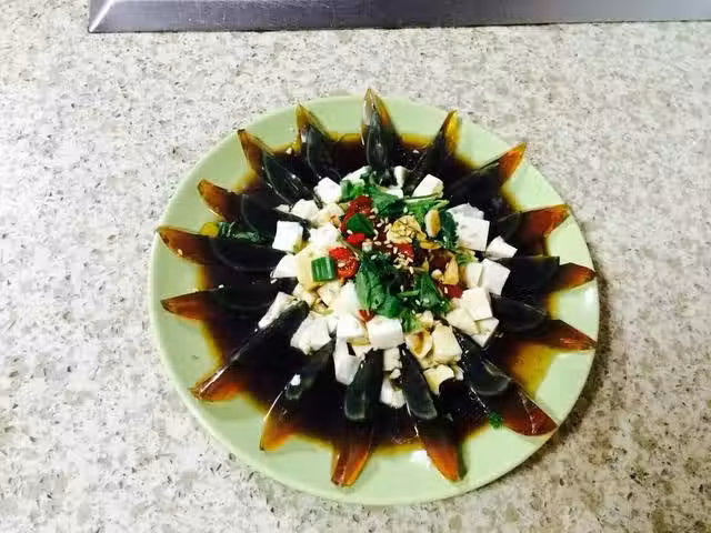 2.將皮蛋延盤子外圈擺放。將豆腐丁放在盤子中間。