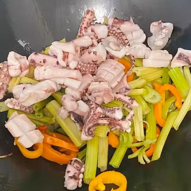 食材:鮮魷魚300克,料酒1勺,薑絲適量,蒜瓣4個,小米辣2個,芹菜200克,彩椒2個,生抽1勺,蚝油1勺,雞精少許。