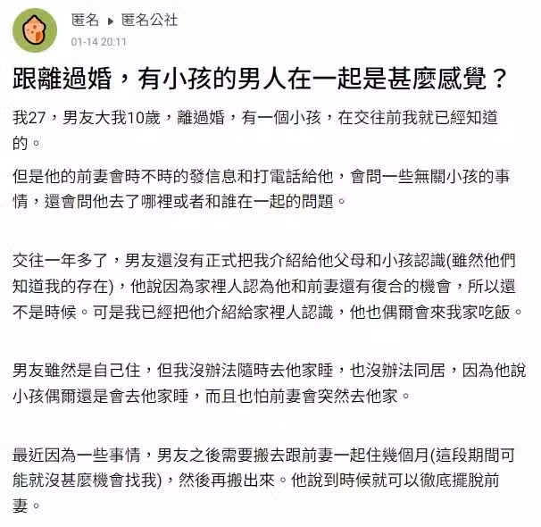 男友離婚有小孩,前妻一直糾纏不清,常常傳訊息、打電話。最近因為一些狀況,需要搬去和前妻同住幾個月,他求我再等等,到時候就徹底擺脫前妻... 我該相信他,還是去認識新的人🧐🧐