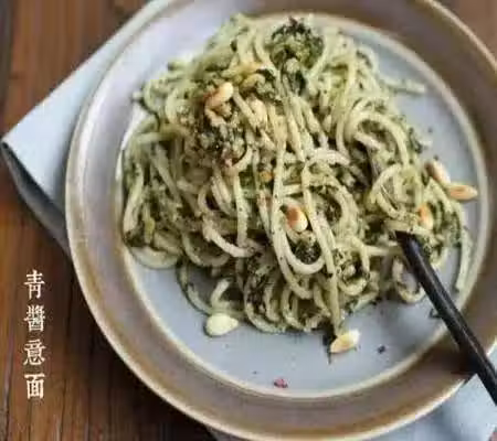 青醬(二人份,羅勒葉一把,松子仁4大匙,鹽、黑胡椒粉、橄欖油、意麵適量