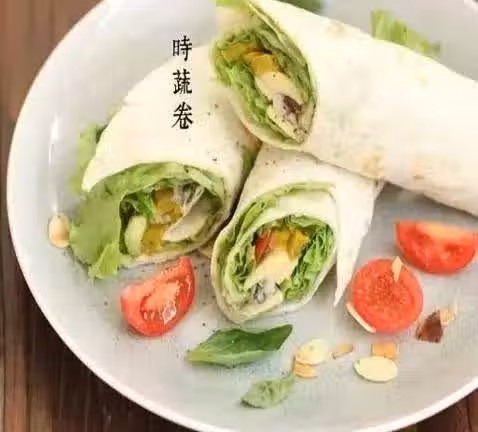 2、取卷餅皮(卷餅皮就是做墨西哥卷的那種,大型超市或淘寶都很容易買到,本身是熟的,吃的時候熱一下即可,冷凍可保存很久)放入加熱好的平底鍋中加熱兩面烤軟待用。首先在餅的中央抹上黃芥末醬(是芥末籽做的醬,不是日本料理里的青芥末哦)然後鋪上生菜,擺上炒好的平菇和彩椒,切好的聖女果和牛油果,撒上烤好的杏仁片,從一端捲起,卷的緊一點,然後斜切兩段即可