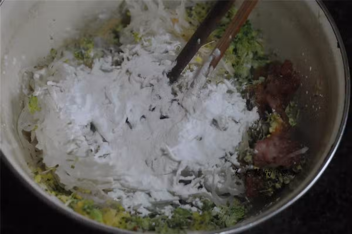 加入少許木薯粉,用筷子拌勻,木薯粉的量根據食材里水分的多少決定,可以一邊攪拌一邊添加,粉越多,口感就越Q彈。拌的時候要用筷子挑起來拌,這樣蘿卜絲能更均勻地被木薯粉包裹。