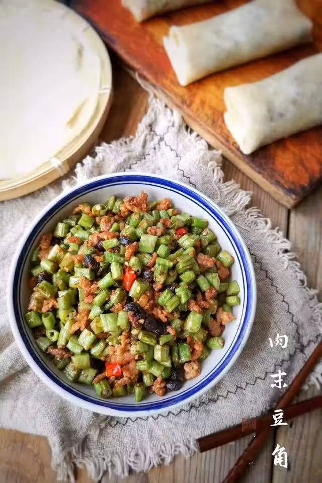 4.鍋中留適當的底油(或者適當加入點食用油),燒熱。下入豆角煸炒。煸炒至豆角變色表皮微黃時加入蒜末翻炒均勻。加適量鹽和雞精翻炒均勻。再加入豆豉和干辣椒翻炒均勻。