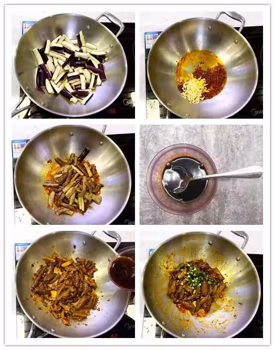 5、把魚香勾芡汁倒入鍋中後快速翻炒茄子,最後撒上一把香蔥,魚香茄子就完成了