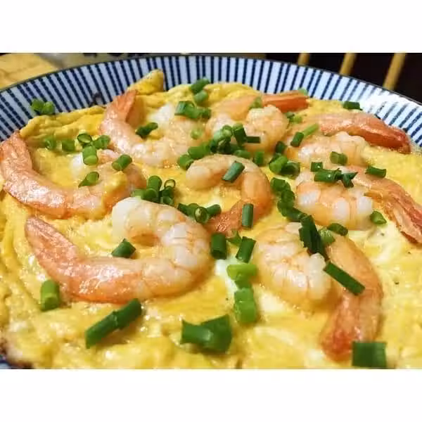 主要配料:鮮蝦8~10隻(約200g)雞蛋3個、洋蔥1/3個、蔥花5g、鹽2g、醬油5g、料酒5g白鬍椒粉一點點、澱粉3g
