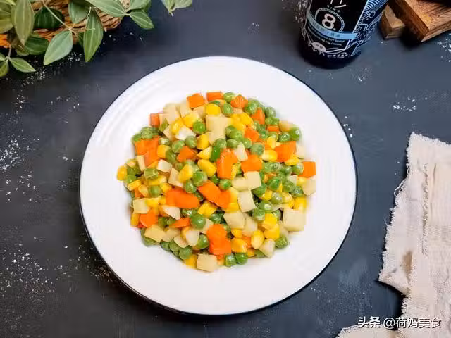 豌豆玉米分別淘洗乾淨,山藥和胡蘿蔔切丁。水開放入玉米,豌豆,胡蘿蔔和山藥丁焯熟撈出。