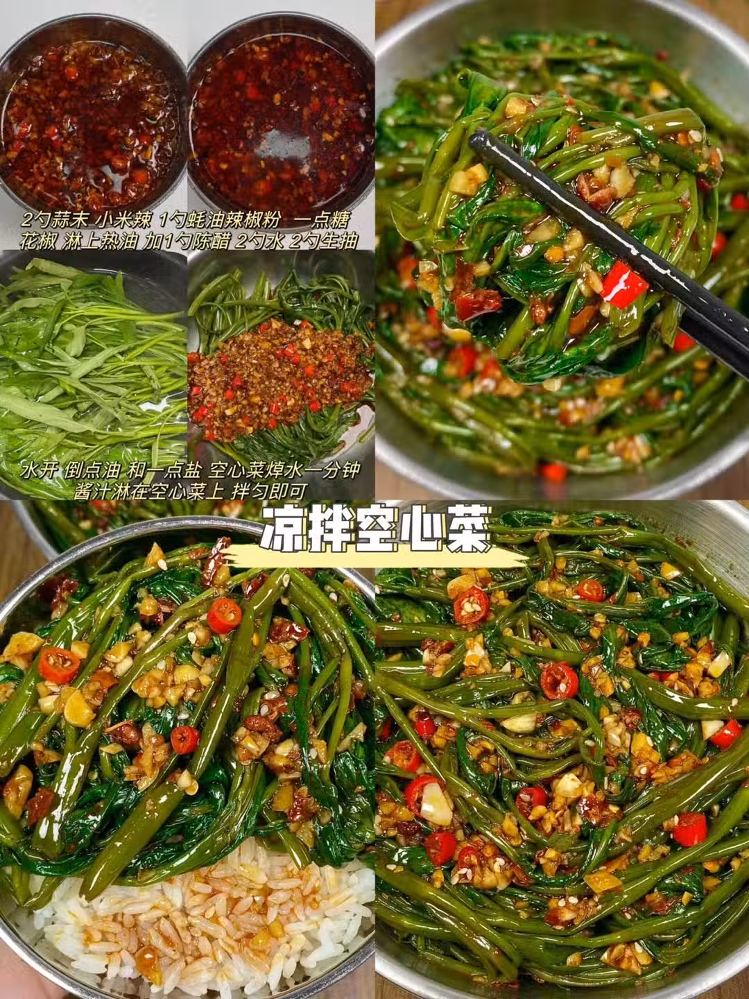 要製作涼拌空心菜,首先選取新鮮的空心菜,洗凈後放入沸水中焯燙,注意時間不宜太長,以保持空心菜的脆嫩和鮮綠色澤。焯水後,迅速將空心菜過冷水冷卻並瀝干。然後,準備調味料,如蒜末、紅辣椒絲、生抽、醋、糖和芝麻油,根據口味調好拌菜汁。將瀝乾的空心菜放入大碗中,澆上拌菜汁,快速拌勻,讓每一根空心菜都能裹上調味汁。這樣簡單的一道涼拌空心菜,脆爽開胃,非常適合夏日食用。