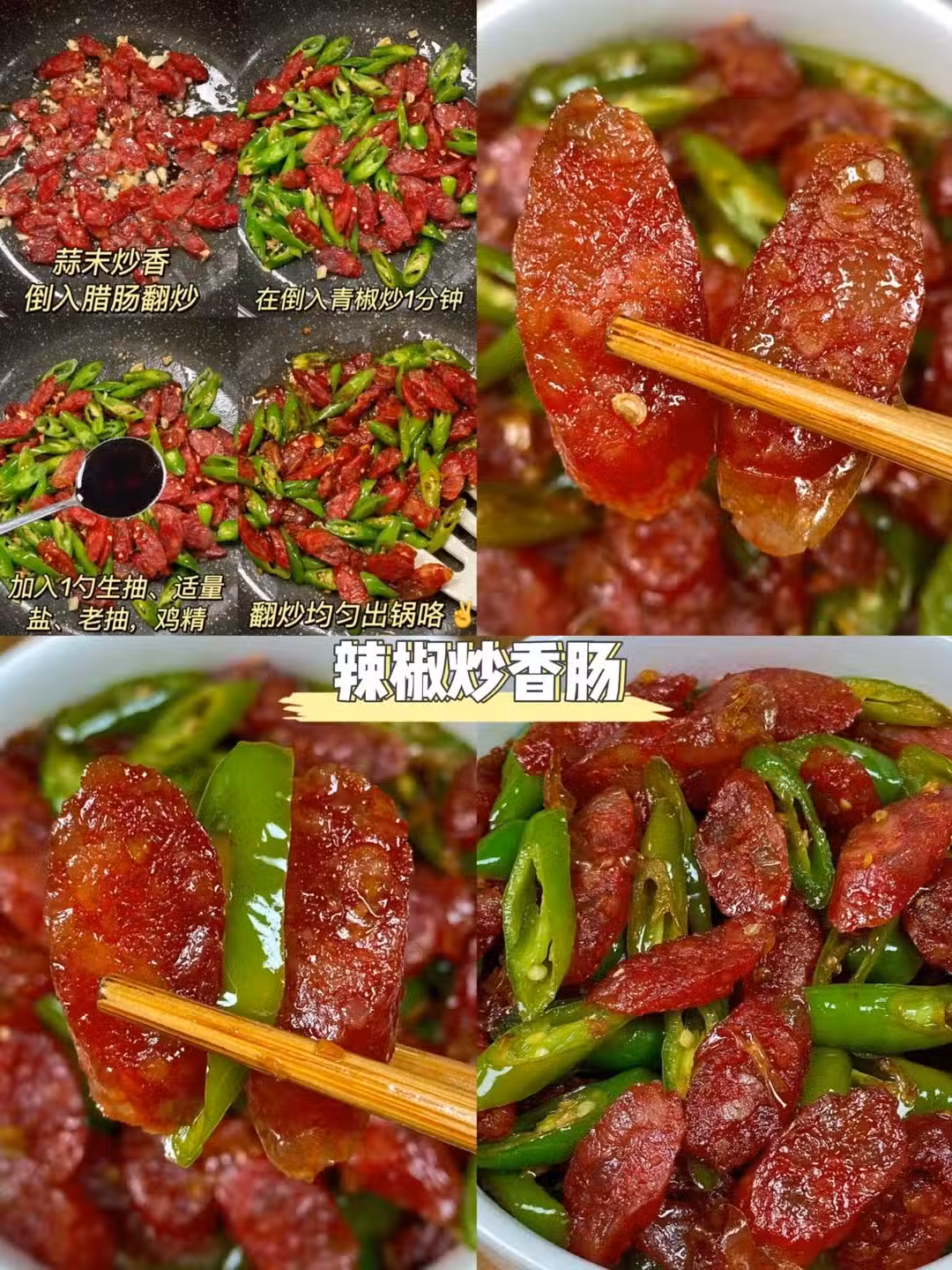 選用有一定辣度的干辣椒和新鮮脆爽的香腸。將干辣椒切段,香腸切片,備用。鍋中加油熱後,下入干辣椒煸炒出香味,隨即下入香腸片。中火翻炒至香腸表面微焦、出油,此時加入少許生抽、鹽、糖等調味,快速翻炒均勻。最後,可以撒上蔥花提味,一道簡單美味的辣椒炒香腸就完成了。