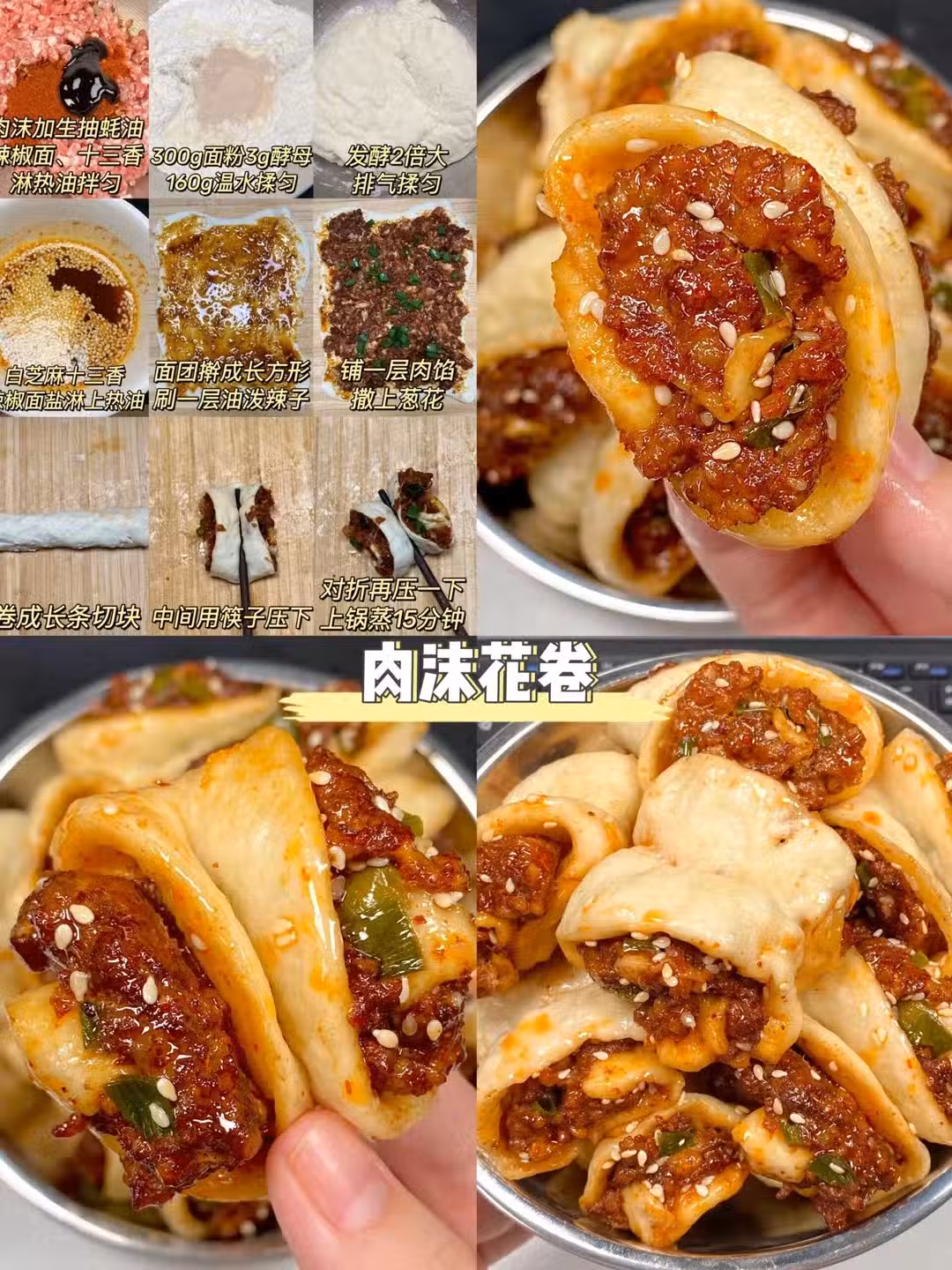 發酵完畢的麵糰擀開成長方形薄片,然後在表面均勻塗抹上事先準備的熱油,撒上蔥花和調好的肉餡。將面片從長邊開始緊緊捲起,捏緊封口,然後按需切割成小段。每段中間用筷子按壓一下,讓肉餡緊貼麵皮,最後將它們放入蒸鍋中,大火蒸約15分鐘,直到花捲蓬鬆熟透。