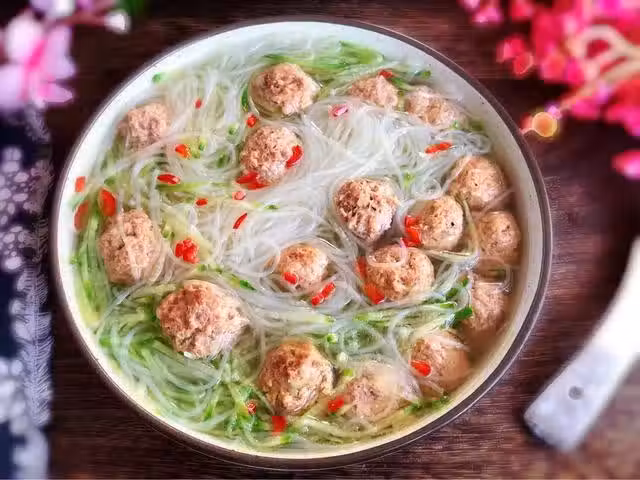 5:再加一勺芝麻香油,越聞越香,越喝越香!蘿蔔粉絲肉丸湯做好了,出鍋前還可以加點紅椒末,香菜末呢……