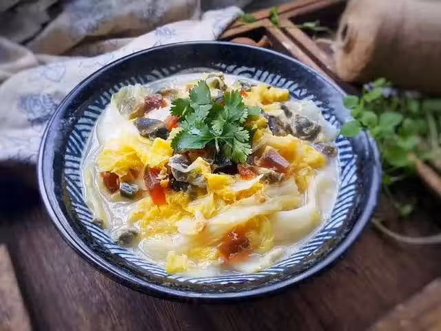 2.白菜只取菜心,切開。投入湯中,大火煮開,轉小火,白菜變軟,加入鹽,就可以關火裝盤了。