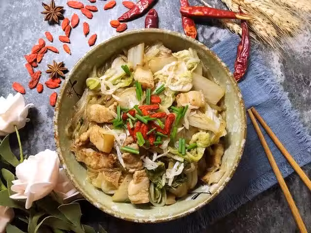 3.加入泡好的粉條,繼續燉至粉絲入味。鍋內留少許湯汁就可以了。出鍋前撒些蝦皮和枸杞子,搞定