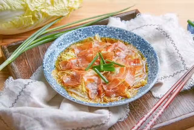 3.切好的白菜幫墊到盤底,鋪上白菜葉和火腿片。再放上薑絲和小蔥段,淋入1大勺黃酒,1大勺生抽,2克鹽。