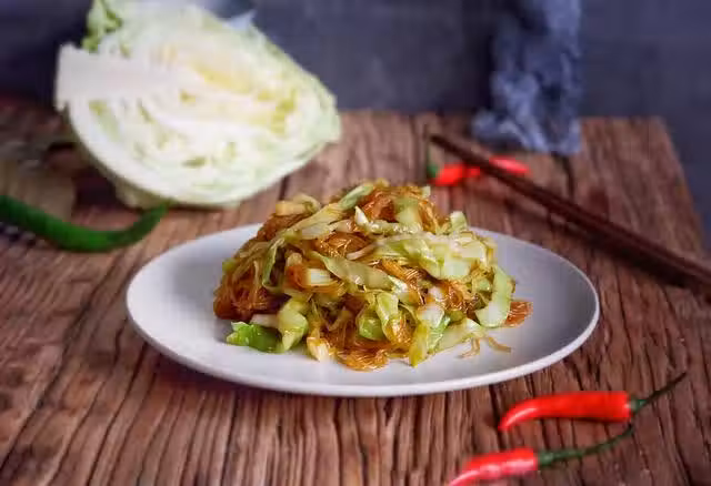 3.鍋內熱油,比你平時炒菜要多一些。這樣粉絲一會加入才不會成一坨,將小米椒和蔥花加入,炒出香味。加入圓白菜,翻炒片刻。