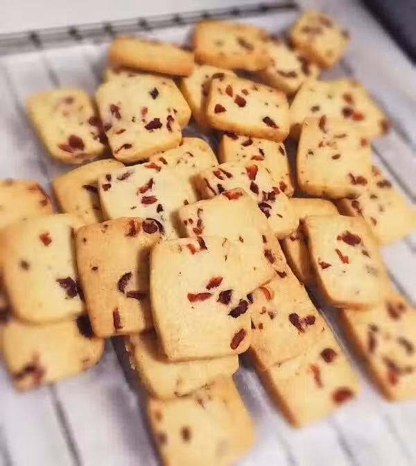3.蔓越莓干提前切碎,加入麵糰內拌均勻。放入模具內,放入冰箱冷凍定型,定型之後,取出來切成厚度均勻的片狀。