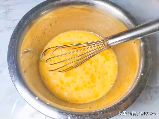 4、將低筋麵粉和泡打粉,混合篩入雞蛋液中,打蛋器畫Z字形攪拌均勻,不要畫圈攪拌,以免麵粉起筋,影響蛋糕口感。