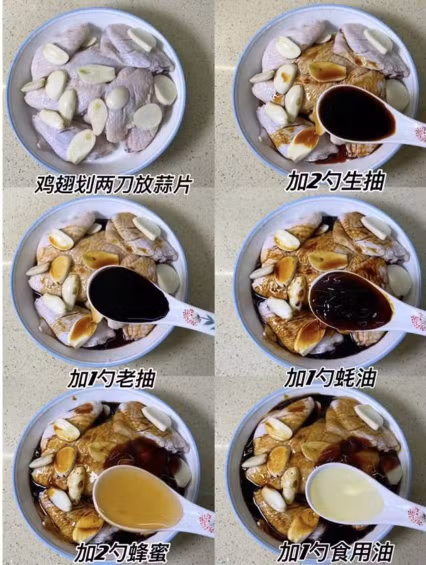 1、腌制雞翅👉:雞翅兩面劃刀➕蒜末2勺生抽➕1勺老抽➕1勺蠔油➕2勺蜂蜜➕1勺油➕少許鹽和黑胡椒,抓勻腌制兩小時入味