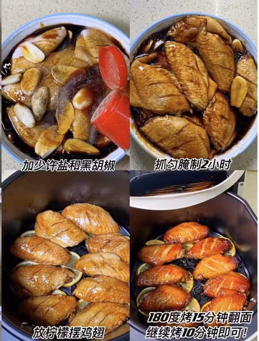 2、先鋪一層檸檬,擺上雞翅,空氣炸鍋180度烤15分鐘翻面再繼續烤10分鐘,表面金黃即可~.....