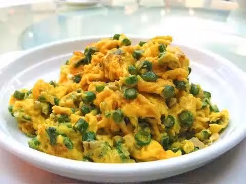 4、熱鍋,倒油,倒入拌均的雞蛋豆角中小火煎至微黃。