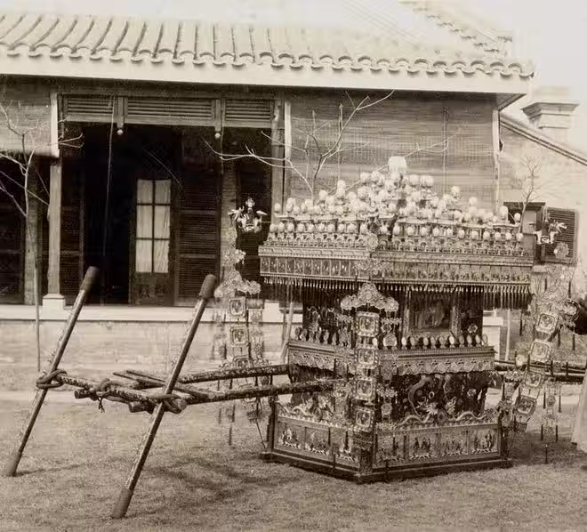 這種迎接新娘的轎子是清末生產的「千工轎」或「萬工轎」。 之所以這樣命名,是因為它需要花費數千上萬個工時。 它採用榫卯結構聯結。 沒有一個釘子,由數百個可拆卸的花板組成,沒有轎門。 舉行婚禮時,由拆轎師傅在迎親隊伍中負責拆卸工作,使新娘可以輕鬆進出。 從遠處看,它看起來金碧輝煌,就像一座微型宮殿,但遺憾的是黑白照片無法恢復其閃耀的色彩。