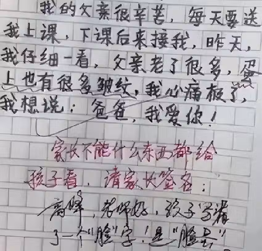 不過這位小學生寫的《我的父親》原本是心疼父親工作辛苦的,但是因為少寫了一個字,導致作文意思變了樣。