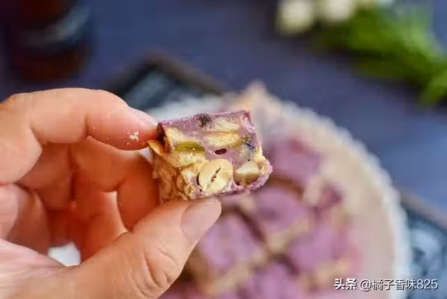 食材:棉花糖180克、澳優能立多G4奶粉45克、紫薯粉10克、葡萄乾和藍莓干共50克、熟花生100克、冰棍180克、黃油40克、表面:一勺紫薯粉、一勺奶粉