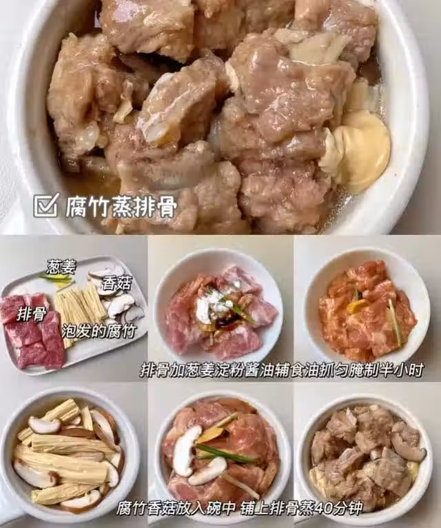 烹飪步驟:排骨加蔥姜澱粉醬油抓勻腌制半個小時,香芋放入蒸碗中鋪上排骨蒸40分鐘。