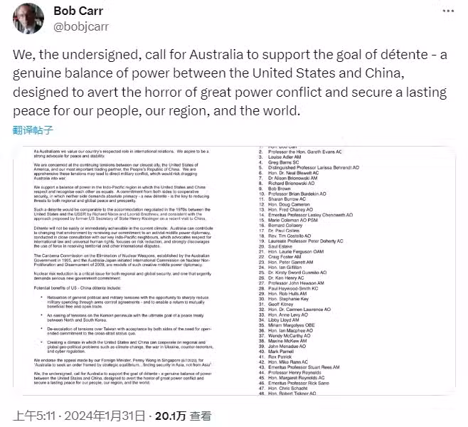 綜合英國《衛報》、「天空新聞網」澳大利亞版(skynews.au)1月31日報道,當地時間周三,包括兩位前外交部長鮑勃·卡爾(Bob Carr)和加雷斯·埃文斯(Gareth Evans)在內的50位澳大利亞社會各界名流發表聯名聲明,呼籲阿爾巴尼斯政府發揮「積極的中等強國」作用,成為「外交中間人」,緩和澳最親密盟友美國與澳最大貿易夥伴中國之間的緊張關係,以防大國衝突「殃及」該國。