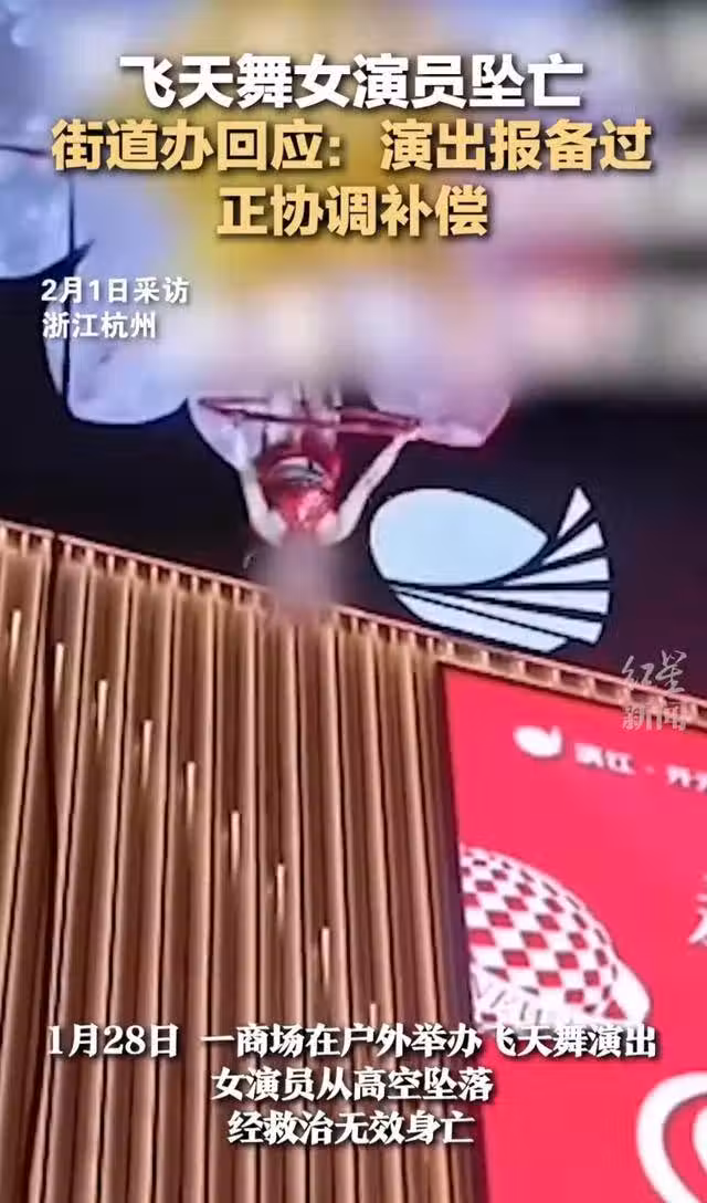 目前,就女演員高空掉落一事官方作出回應,女演員經過搶救最終醫治無效去世,據傳年齡僅28歲,遺體已送往殯儀館,此事已立案,對涉事單位和人員將進行調查,街道辦就此事也作出回應,正在協調補償。