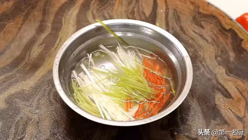 4.在蒸魚的時間,準備一些配料,大蔥半根切成蔥絲,生薑一塊切成薑絲,青紅椒各半個切成紅椒絲,放入清水盆中,浸泡三分鐘。