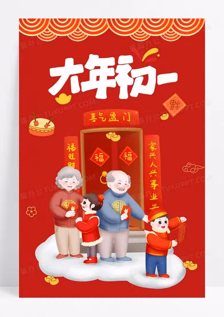 大年初一,給您拜年,祝福:財到、運到、福氣到,家庭幸福,福壽雙全