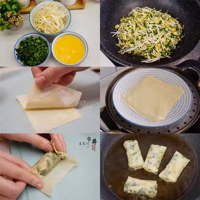6、平底鍋倒油,油燒熱放入春卷煎到兩面金黃夾出即可,簡易版的韭菜合子就做好了。
