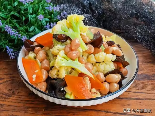 【花菜拌花生】所需材料:花菜半顆、花生米1碗、木耳適量、胡蘿蔔1段、油鹽適量、香油1湯匙、花椒20-30粒、八角2個、味精少許、