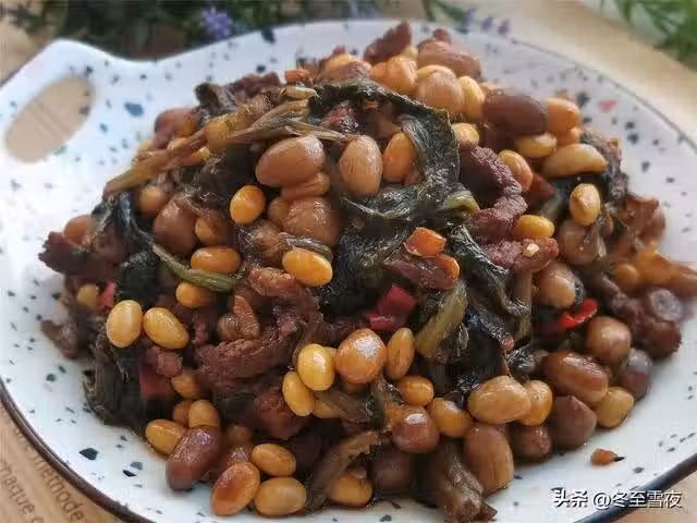 【雪裡蕻燜黃豆花生米】所需材料:腌制雪裡蕻1斤、花生米1小碗、黃豆1小碗、豬肉100克、小米辣2-3個、油鹽適量、蔥1段、姜2片、大蒜2瓣、十三香1茶匙、白糖少許、生抽1湯匙、老抽半湯匙、