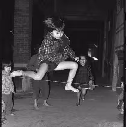 9、一群孩子們玩著跳繩游戲,這是最常見的游戲之一,通常使用有彈性的橡皮筋,有幾種玩法。由於女生肢體柔軟,往往跳得比男生好。跳繩雖是簡單的游戲,卻帶來許多歡樂。