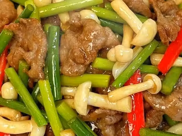3、起鍋燒油,油熱後放入腌制好的瘦肉翻炒,炒干水分後放入姜蒜小米辣炒香,再放入蒜苔和白玉菇翻炒均勻。
