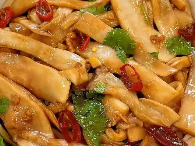2、杏鮑菇清洗乾淨切成片,水開後放進去焯水煮熟,然後撈起來擠干水分,裝入碗中備用。
