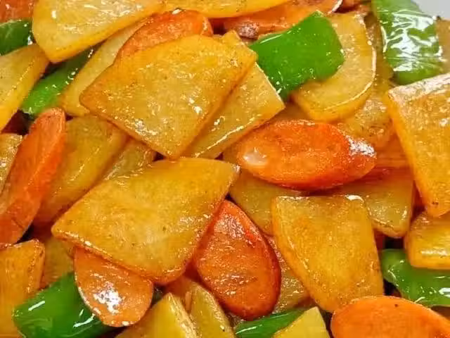 2、起鍋燒油,油熱後放入土豆煎一下,煎至兩面微黃,接著倒入火腿腸翻炒片刻,炒香後放入青椒和蒜末翻炒一會兒。