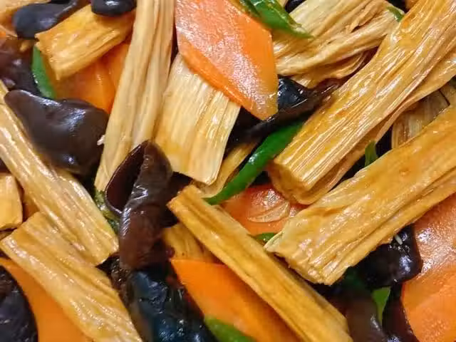 準備食材:腐竹,黑木耳,胡蘿蔔,青線椒,蒜片。