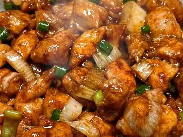 2、起鍋燒油,油熱後放入雞腿肉翻炒一會兒,炒至焦黃後加入生抽、蚝油、白糖調味,翻炒均勻炒至入味。