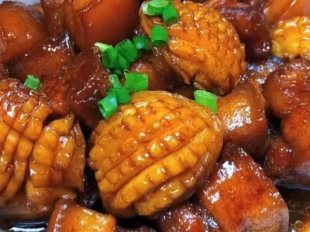 5、時間到,再放入鮑魚,繼續蓋上蓋子燜煮五分鐘。煮熟後,撒上蔥花點綴即可出鍋開吃。