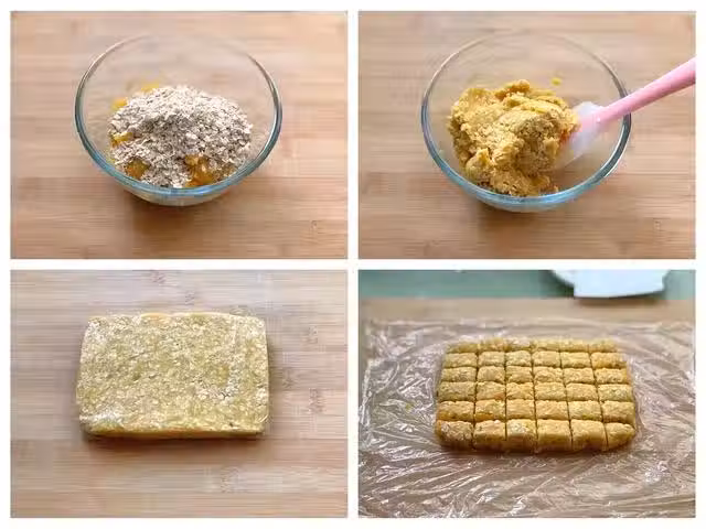 第三步:將紅薯泥捏成適口的小方塊,放入提前鋪好油紙的烤盤中,烤箱提前預熱180度,將烤盤放入烤箱中層,上下火180度烤18-20分鐘,烤好後取出晾涼即可。