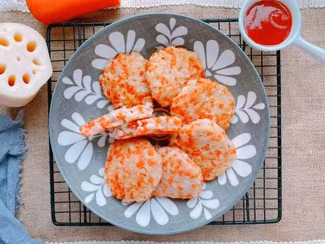 6、蝦仁藕餅還可以蘸點番茄醬,酸酸甜甜特別好吃。