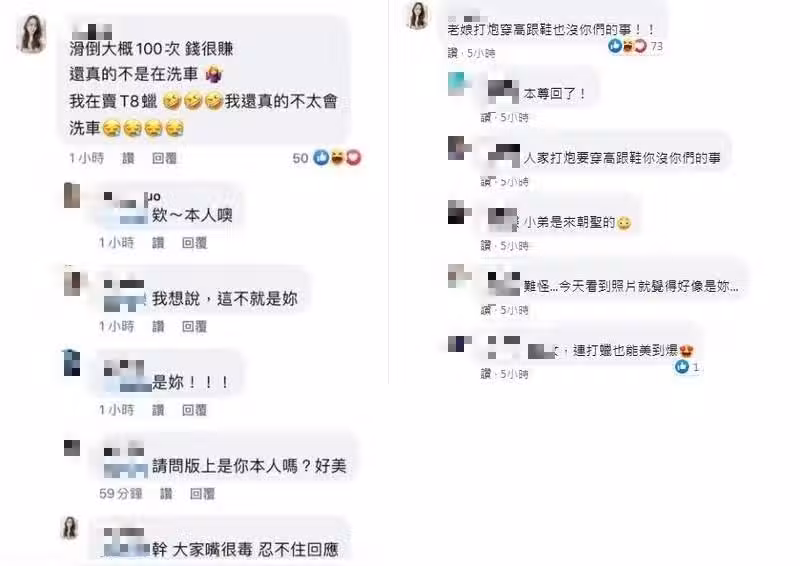 對此,有網友神出這名正妹,是一位在專門拍賣的FB粉專工作的女主播,並立刻有與她認識的朋友在推文中標記她的名字,隨後這名正妹也親自在貼文回應,大方承認她當時並不是在洗車,而是在賣保養汽車用的T8蠟,「我還真的不太會洗車」!對於部分網友猛力批評,她也忍不住抱怨「大家嘴很毒,忍不住回應」;至於許多網友嗆他穿高跟鞋「太假」、「假掰」,她更怒嗆「老娘打X穿高跟鞋也沒你們的事!」這名正妹親自在貼文回應,大方承認她並不是在洗車,而是在賣保養汽車用的T8蠟,對於部分網友猛力批評,她也忍不住抱怨「大家嘴很毒,忍不住回應」。