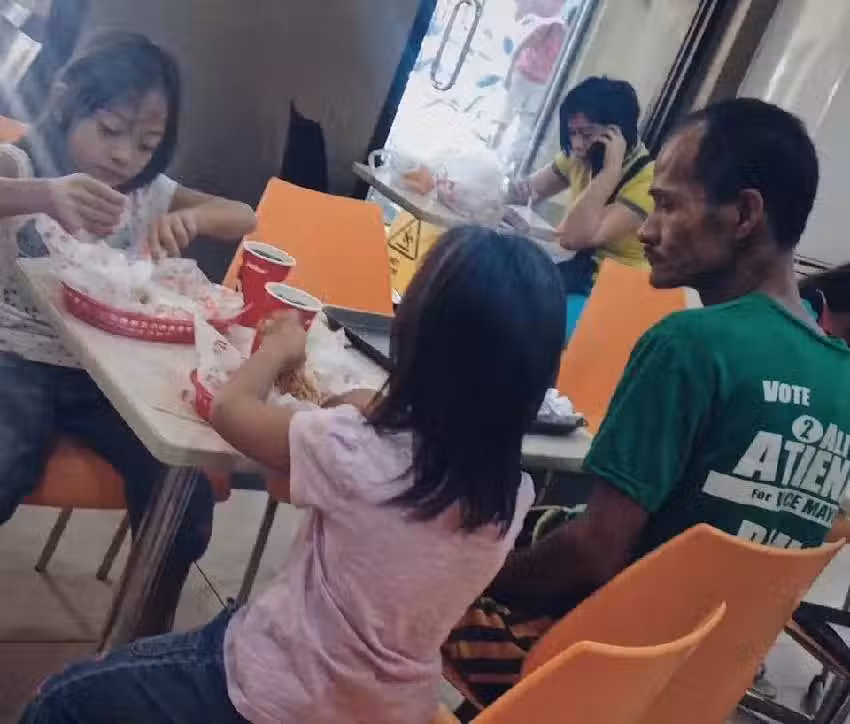 照片中的爸爸萊恩(RyanArebuabo)在速食餐廳Jollibee看著兩個可愛女兒正在吃東西。貼文者表示:「我在Jolibee看到他們的時候,一時忍不住感到難過。他為了讓他為了讓女兒們可以吃到自己想要吃的,不惜自己餓著肚子。這張照片代表著父愛,也代表著完全無私的表現。」