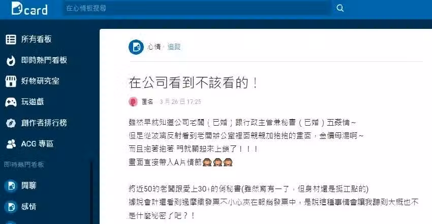 女員工接著說,老闆年紀將近50歲,秘書也有30幾歲且育有一子,身材非常正點;最離譜的是,兩人還曾不小心把到摩鐵開房間的發票夾在公司報銷發票中,意外洩漏兩人婚外情一事,如今對同事們來說已見怪不怪。