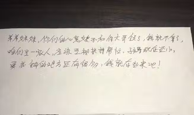 看完字條上的字,莉莉淚如雨下,她懂得,親情是無價的,也是骨肉相連的情感。